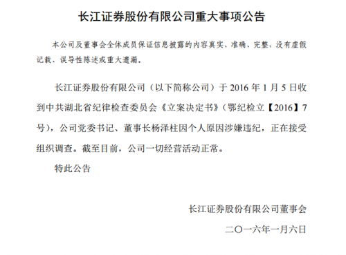 新浪财经讯 长江证券(11.31, 0.05, 0.44%)6日早间公告称,公司党委书记、董事长杨泽柱因个人原因涉嫌违纪,正在接受组织调查。截至目前,公司一切经营活动正常。