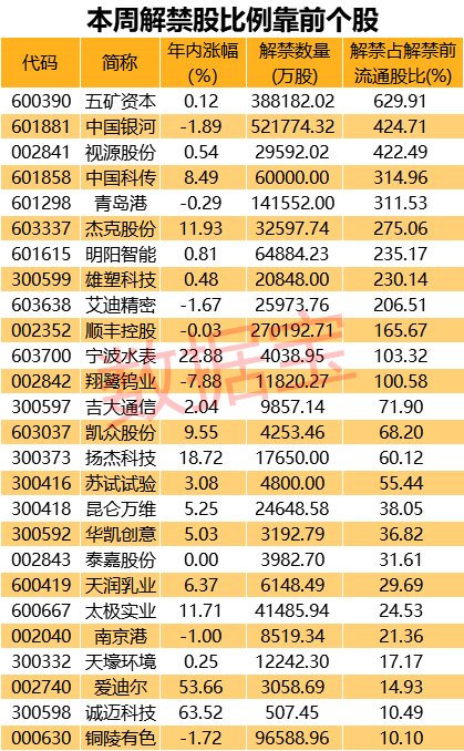 此外,本周解禁规模靠前的股票还有中国银河、五矿资本、视源股份,解禁市值都超过了200亿元。