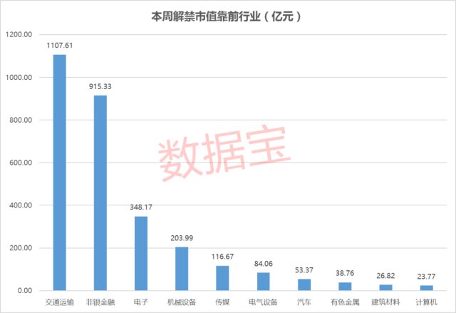 解禁股从市值来看,交通运输、非银金融行业最高,分别有1107.61亿元和915.33亿元,解禁市值较高的还有电子、机械设备、传媒行业,解禁市值都超过了百亿。