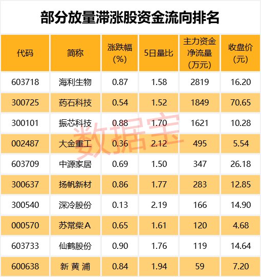 值得注意的是,23只放量滞涨股中,海利生物、药石科技、振芯科技、大金重工、中源家居等个股主力资金净流入较多。