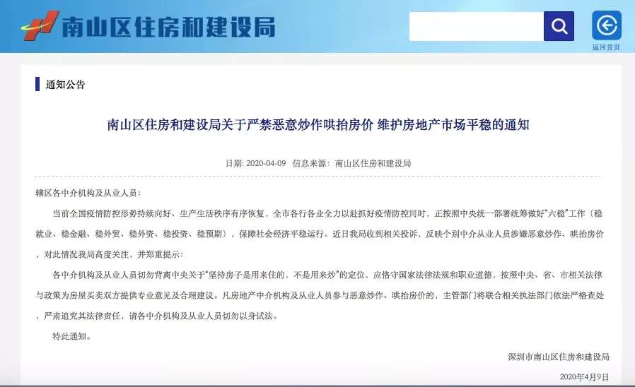 这些乱象引发主管部门高度关注。昨日,深圳市南山区住房和建设局发布《关于严禁恶意炒作哄抬房价维护房地产市场平稳的通知》。